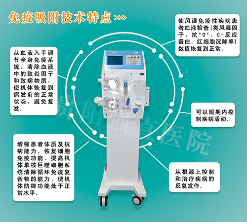 在風(fēng)濕免疫性疾病治療領(lǐng)域,免疫吸附技術(shù)的工作原理是用灌流器上面特有的抗原將血液中的免疫復(fù)合物、自身抗體、尿酸鹽結(jié)晶、類風(fēng)濕因子等發(fā)病因素吸附并清除,再將凈化的血漿回輸體內(nèi),從而達(dá)到凈化血液、調(diào)節(jié)機(jī)體免疫,縮短病人的病程,迅速減輕風(fēng)濕疾病的癥狀,終達(dá)到防止疾病再?gòu)?fù)發(fā)的目的。