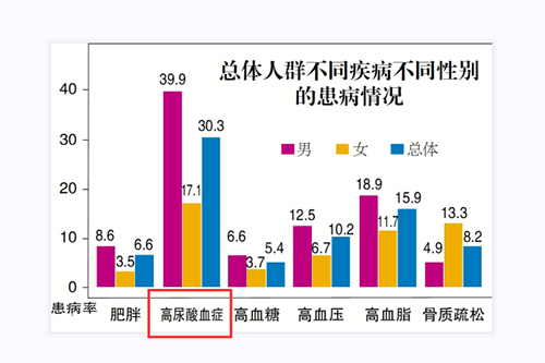 在物質(zhì)匱乏的年代,尋常百姓很少能聽到痛風(fēng)這個名詞,然而,隨著生活水平的提高和高嘌呤食物的大量攝入,越來越多的人罹患痛風(fēng),由于男性體內(nèi)的雌激素水平低于女性,其體內(nèi)的雄激素不能促進尿酸排泄及抑制尿酸生成,這也是為什么痛風(fēng)好發(fā)于男性的主要原因之一。