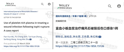 隨著此次《國際風濕病雜志》收錄我院SCI文章《富血小板血漿治療痛風石破裂后傷口感染1例》,標志著我院在痛風、痛風石臨床診治及科研方面,具備專業(yè)領(lǐng)先水平!