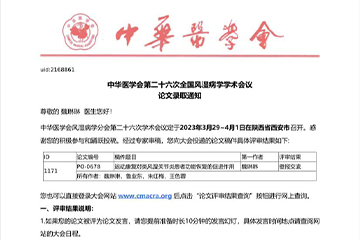 近日,我院收到來(lái)自中華醫(yī)學(xué)會(huì)學(xué)術(shù)會(huì)務(wù)部、中華醫(yī)學(xué)會(huì)風(fēng)濕病學(xué)分會(huì)聯(lián)名發(fā)出的論文錄用郵件,通知我院學(xué)術(shù)論文被國(guó)內(nèi)風(fēng)濕病學(xué)... [詳情]